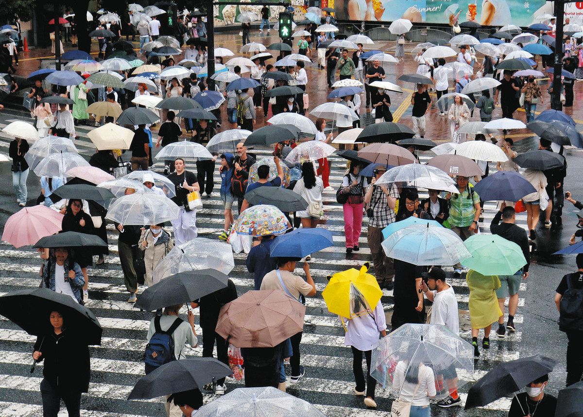 傘を差してスクランブル交差点を歩く人たち=6月21日、渋谷区で
