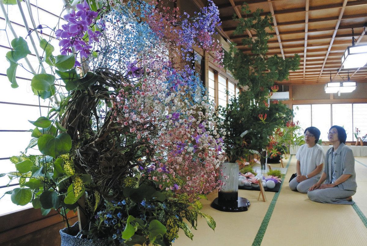渡辺華靖(かせい)家元ら全国の指導者や、幼稚園児から90代までの生徒ら計約60人が出品。ヒマワリやユリ、アガパンサスなど主に夏の花を使った作品が会場を彩る。水に浮かぶ花で涼しさを演出した作品もあり、訪れた人を楽しませている。