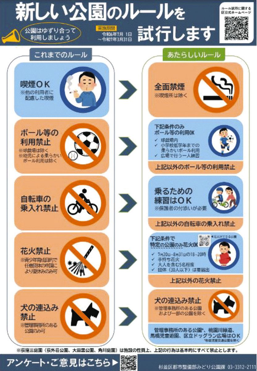 こうした意見を踏まえ、新たなルールでは、分煙施設がある区内5カ所を除く全ての公園などで喫煙不可とした。これまでできなかったボール遊びは、柔らかいボールの利用、安全確保などの条件付きで可能になる。保護者が付き添い、乗るための練習をする場合は、自転車の乗り入れも認めた。