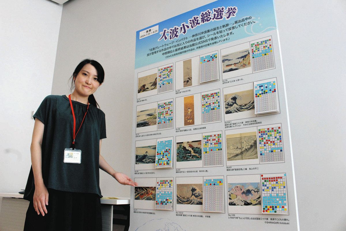 作品の人気投票「大波小波総選挙」のパネル=墨田区亀沢のすみだ北斎美術館で