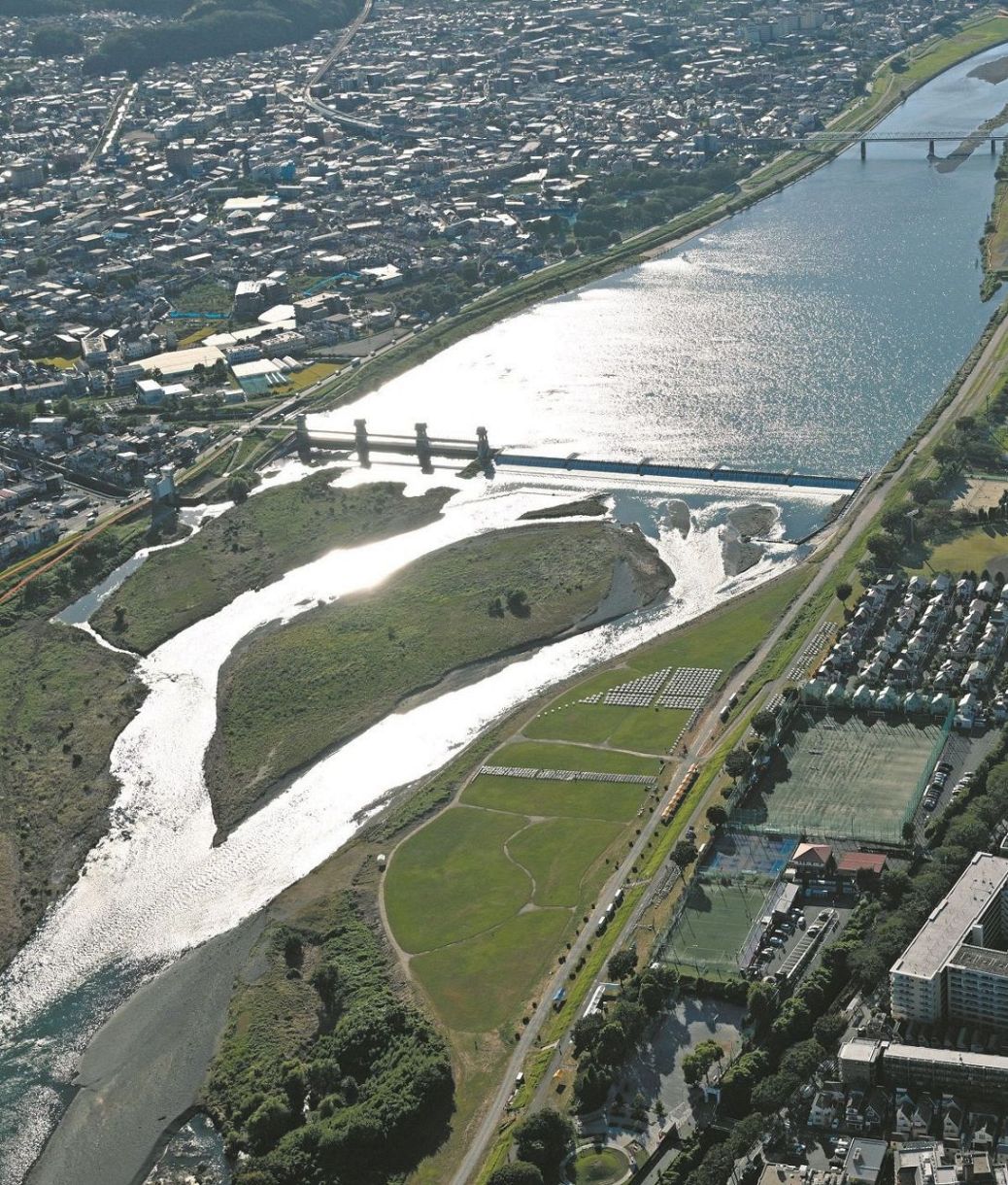 残暑が厳しく、各所で猛暑日となった11日。強い西日を浴び照り返す多摩川=本社ヘリ「あさづる」より須藤英治撮影