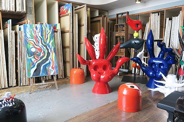 600 以上のキャンバスと彫刻作品に囲まれたアトリエ。建築当時、話題を呼んだユニークな建物は、友人である建築家の坂倉準三氏の設計によるもの。