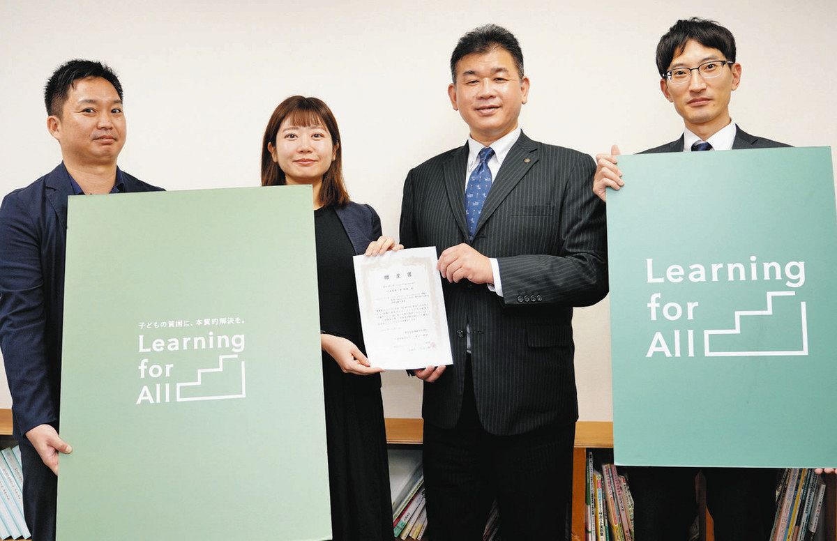 助成金贈呈書を受け取った「Learning for All」の中川祥子さん(左から2人目)ら=新宿区で