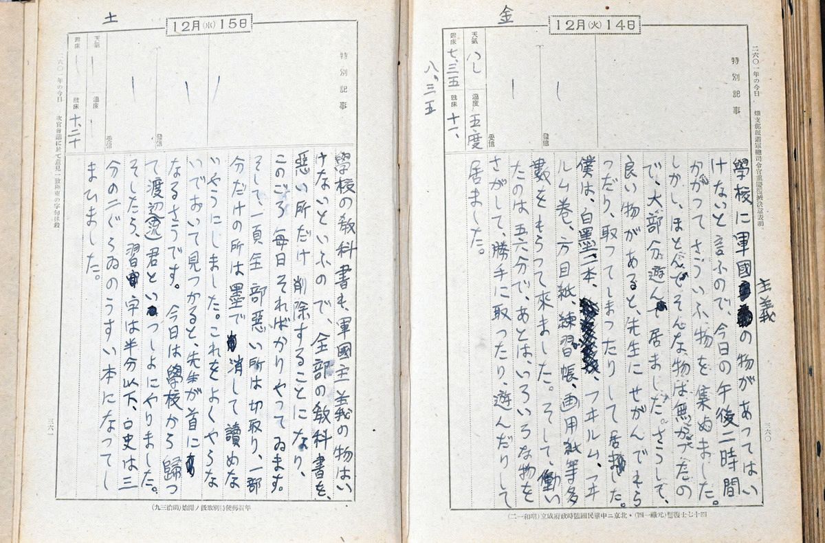 日記の12月15日の続きを読むと「一頁(ページ)全部悪い所は切(きり)取り、一部分だけの所は墨で消して読めないようにしました。これをよくやらないでおいて見つかると、先生が首になるそうです」とある。