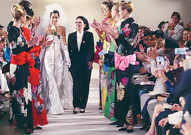 森英恵(右)の孫の森泉さん(左)が出演したハナヱ・モリ ファイナルオートクチュールコレクション 2024年7月7日提供:森英恵事務所