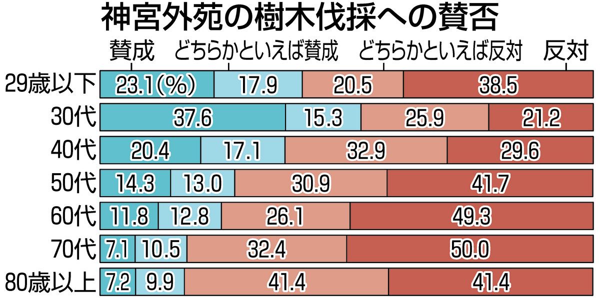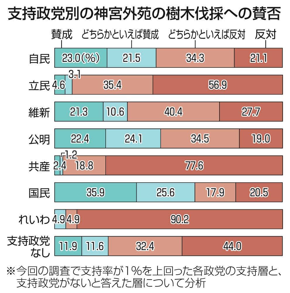 支持政党別では、立憲民主、共産、れいわ新選組のそれぞれを支持と答えた人の9割以上が樹木伐採に「反対」で、自民、公明支持層は賛否が拮抗(きっこう)した。「賛成」が最多は、国民民主支持層の35.9%だった。