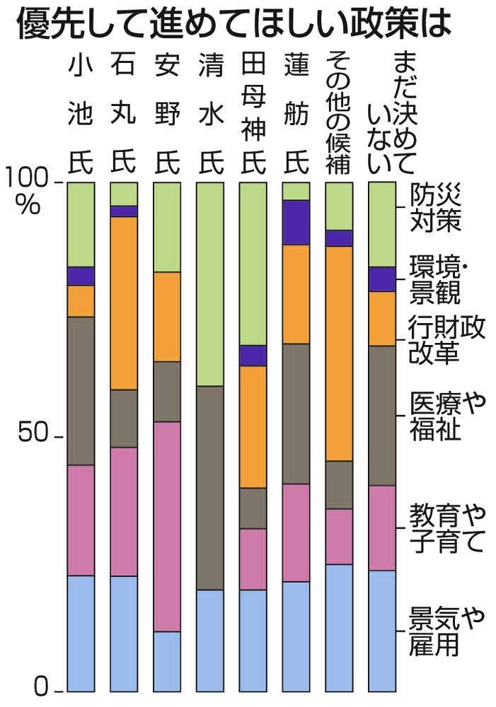 投票予定先で見ると、小池氏と清水氏、蓮舫氏に投票するとした人は「医療や福祉」を重視。清水氏に投票予定の人は「防災対策」にも期待した。安野氏に投票するとした人は「教育や子育て」、田母神氏に投票予定の人は「防災対策」、石丸氏に投票予定の人は「行財政改革」がそれぞれ最も多かった。
