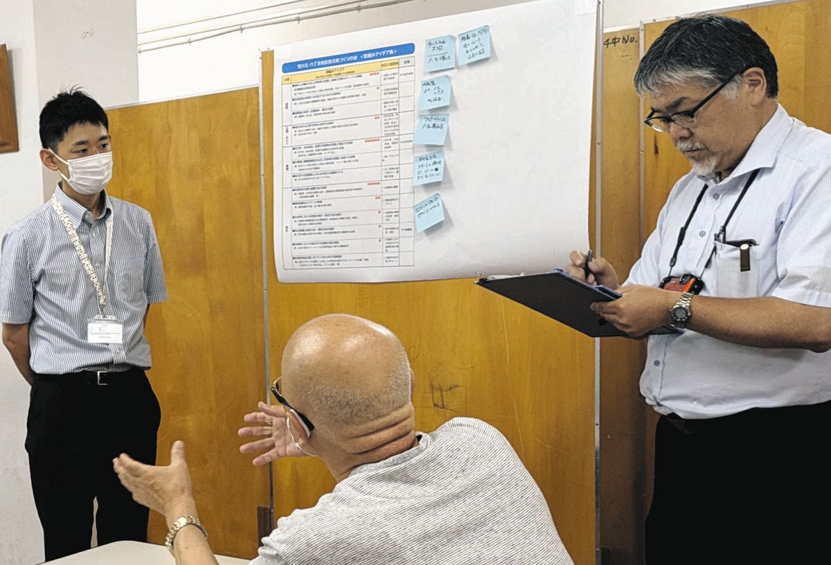 「防災まちづくりの会」で住民からの意見を書き留める区側の担当者(右)=東京都荒川区で