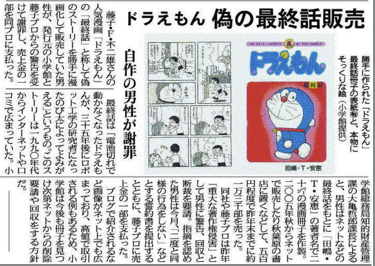 2007年には漫画『ドラえもん』の「最終話」と称した同人誌を2005年から販売していた男性が発行元の小学館と藤子プロから警告を受け、謝罪して売上金の一部を同プロに支払った事例が話題となった。