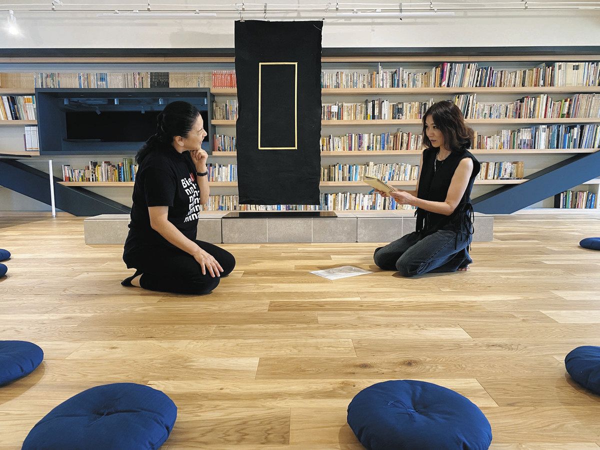 茶会の会場となるMaで打ち合わせをする岡本恭子さん(左)と志村ひろみさん=新宿区で