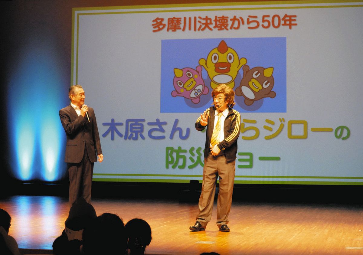 小田急線狛江駅前の狛江エコルマホールで催されたイベントには、親子連れら約550人が参加。気象予報士の木原実さんと、当時は市の新人職員だった松原俊雄市長が登壇した。松原市長は74年4月に入庁したばかりで、水害では避難所の運営を担当した経験を語った。