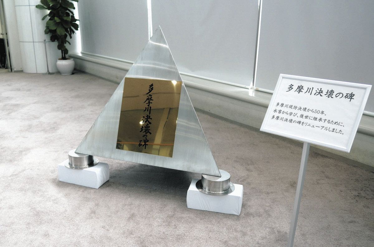 1974年9月に東京都狛江市で堤防が決壊し、家屋19棟が流失した「多摩川水害」から50年を迎えた1日、市は当時の被害や現在の対策などを知ってもらう防災イベントを開いた。リニューアルした「多摩川決壊の碑」も公開した。(北浜修)