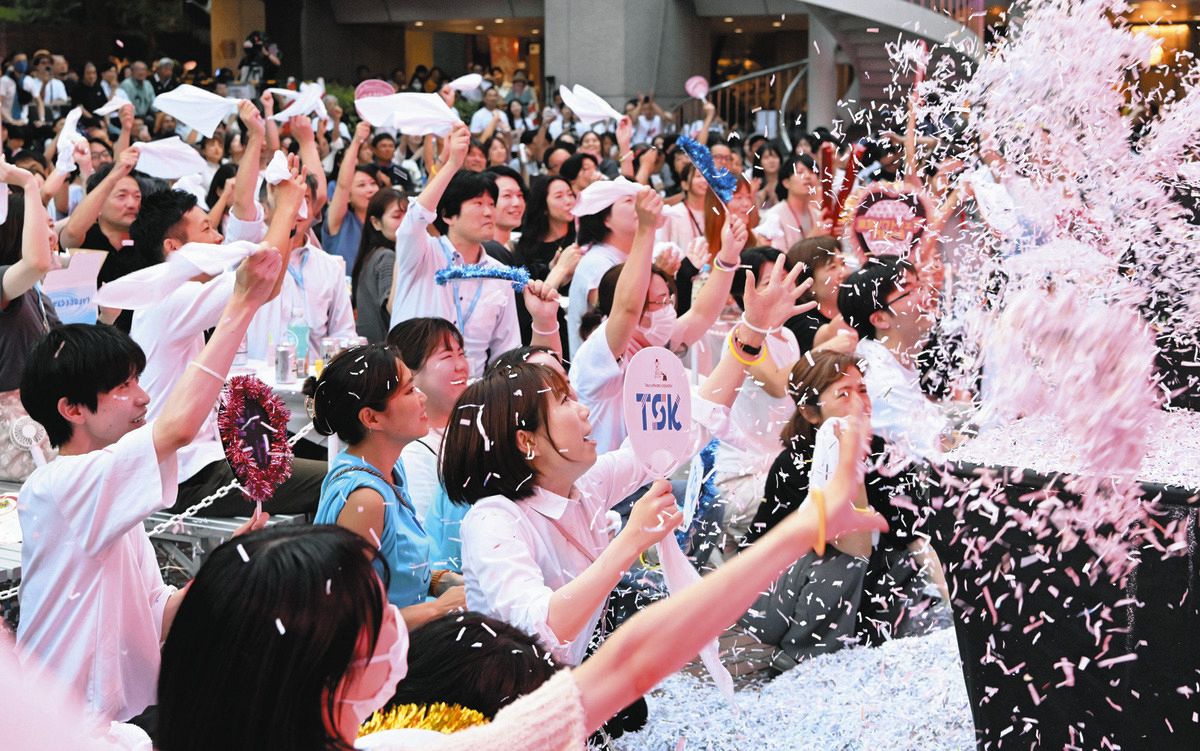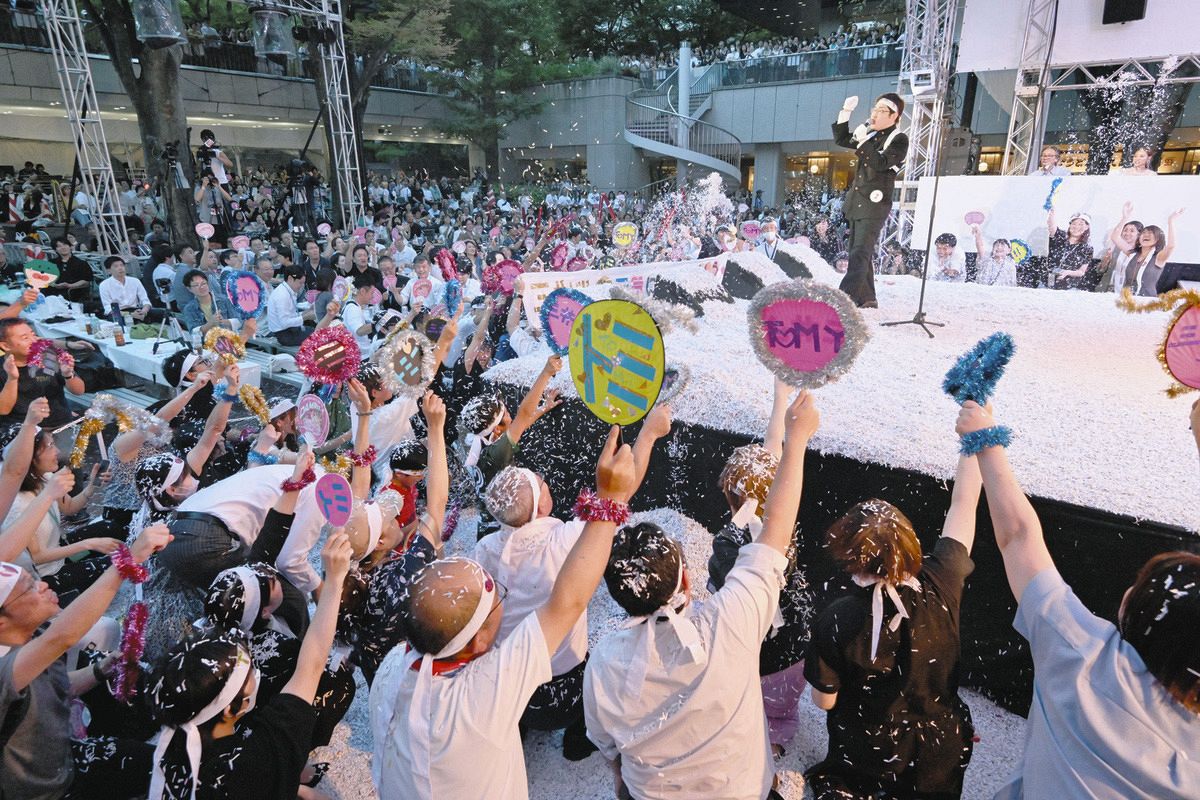 「最後のサビ、みんなで歌っていきましょー!」。入居するウィルオブ・コンストラクション社員の青島広美さん(25)が、ビル広場の特設ステージから呼びかけた。曲はスキー用品のCMソングに使われて大ヒットした広瀬香美さんの「ロマンスの神様」。シュレッダーで裁断した紙吹雪が舞う中、抜群の歌唱力をスキーウエア姿で披露すると、聴衆も「ボーイ・ミーツ・ガール」と呼応。アーティストのライブさながらの一体感を生み出した。
