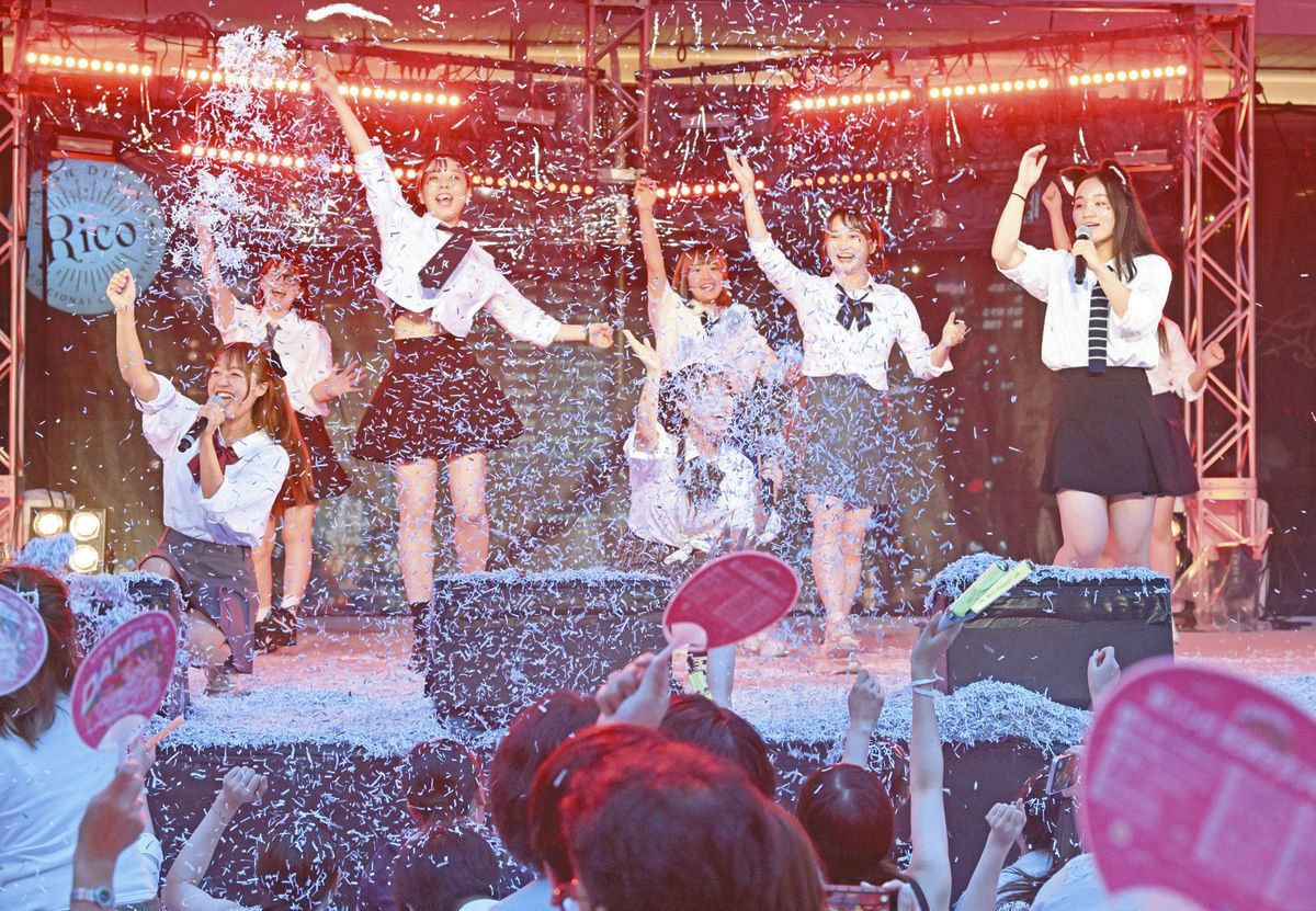 紙吹雪が舞う中、笑顔でパフォーマンスする参加者たち