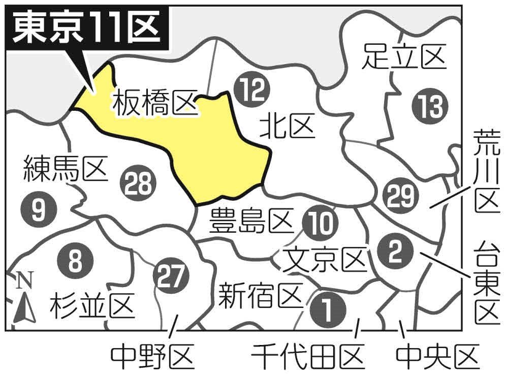 衆院東京11区選挙人名簿登録者数は39万875人(14日現在)。都内有数の商店街「ハッピーロード大山商店街」がある。複数の鉄道路線が通り、都心へのアクセスが良好なことからベッドタウンでもあり、子育て世帯も多い。今回の衆院選で変更された区割りで、高島平団地がある板橋区北部は12区へ移った。