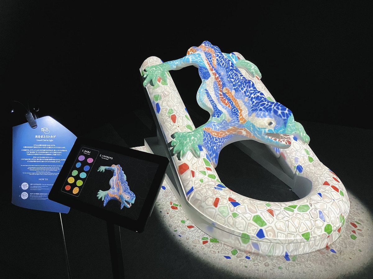 「光をまとうトカゲ」タブレット上のトカゲを指でなぞると色が変化する