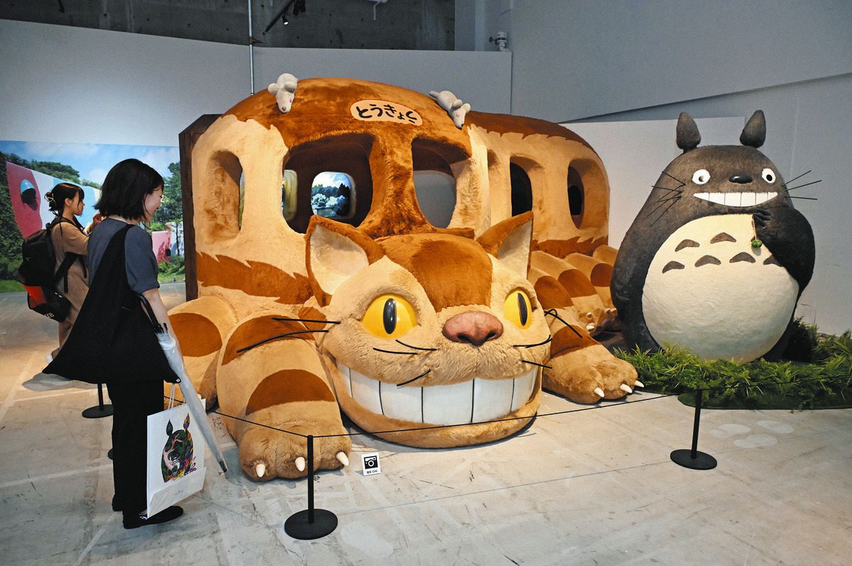 「ジブリパークとジブリ展」は、「ハウルの城」や「サツキとメイの家」の模型のほか、映画「千と千尋の神隠し」のキャラクター「カオナシ」や「湯婆婆」、「となりのトトロ」に登場する「ネコバス」の立体模型も展示している。日時指定予約制で大人1900円、中高生1600円、小学生1200円。詳細は公式ホームページで。