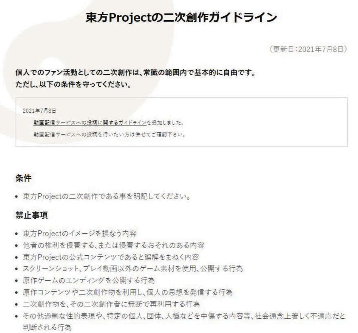 「東方Project」の二次創作ガイドラインの抜粋(公式ホームページから)
