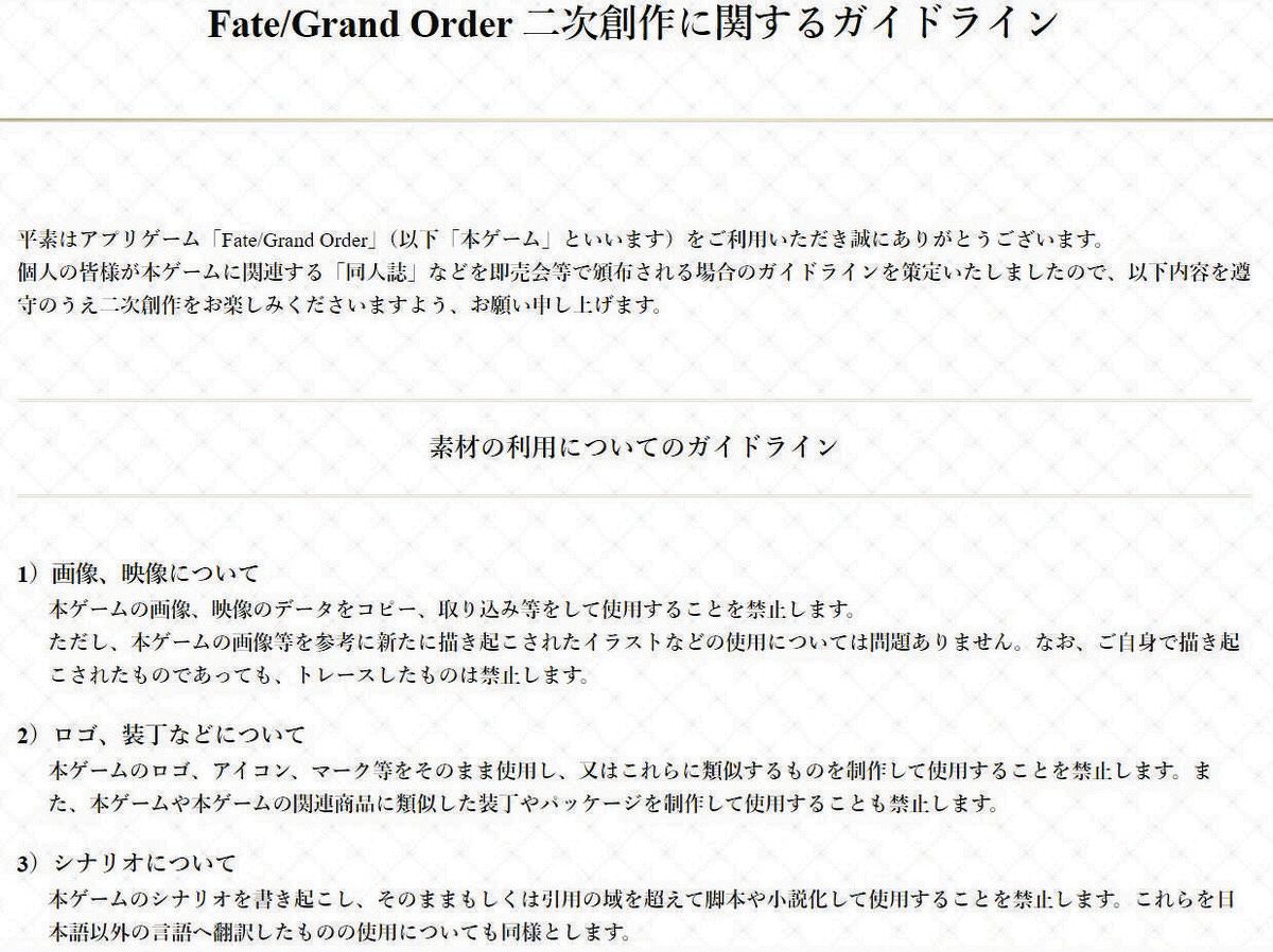「Fate/Grand Order」の二次創作に関するガイドラインの抜粋(公式ホームページから)