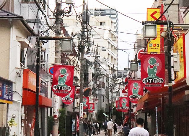 地蔵通り商店街には子育地蔵尊のイラストが描かれたフラッグがかけられている。