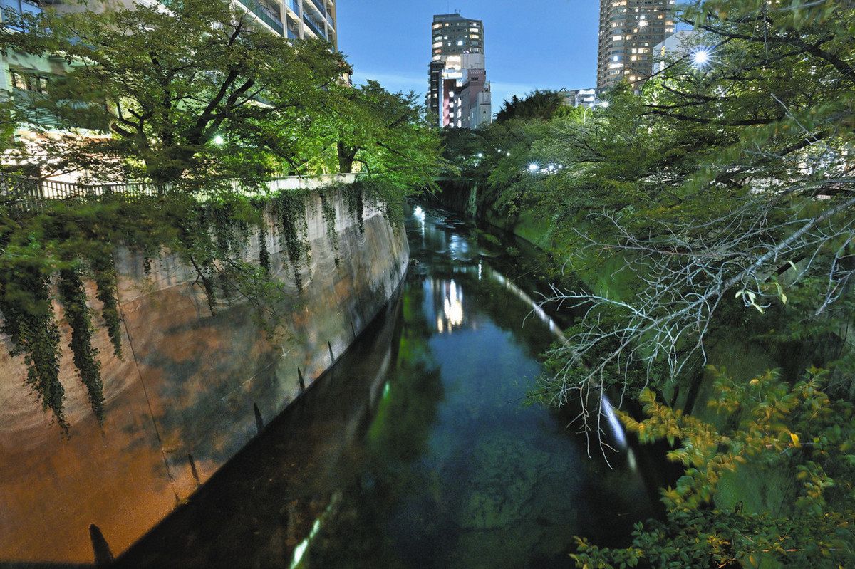 お岩の死体を投げ込んだ場所とされる面影橋(当時、姿見橋)から見た夜の神田川
