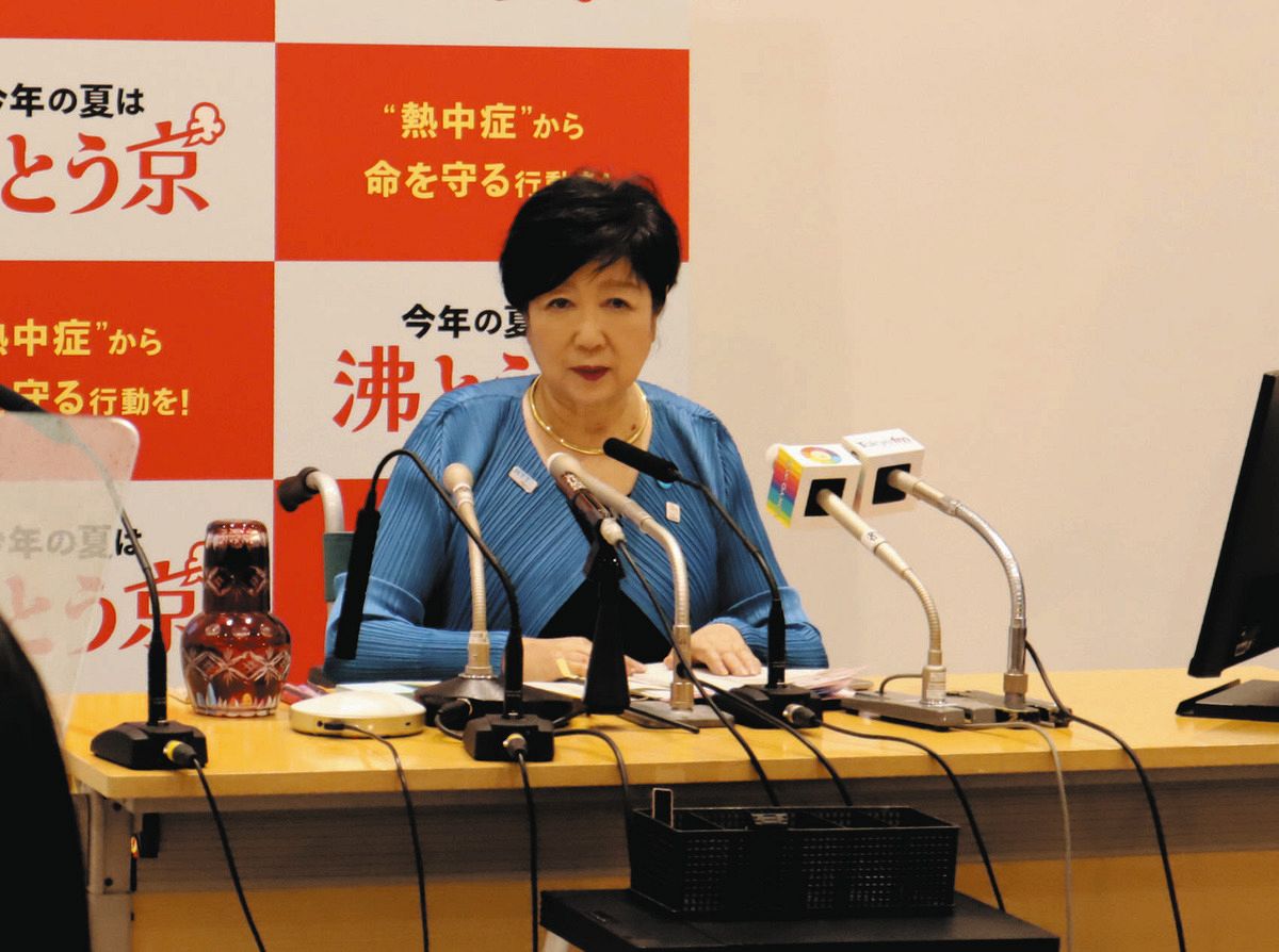 定例の記者会見で話す小池百合子都知事=23日、都庁で