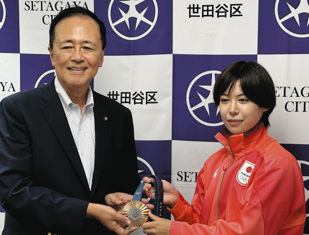 パリ五輪のフェンシング女子フルーレ団体で銅メダルを獲得した東京都世田谷区出身、在住の宮脇花綸(かりん)選手(27)が3日、区役所を訪れ、保坂展人区長にメダル獲得を報告した。4年後のロサンゼルス五輪の金メダルを見据え、「今後の国際大会では個人でも団体でも結果を残していきたい」と抱負を語った。