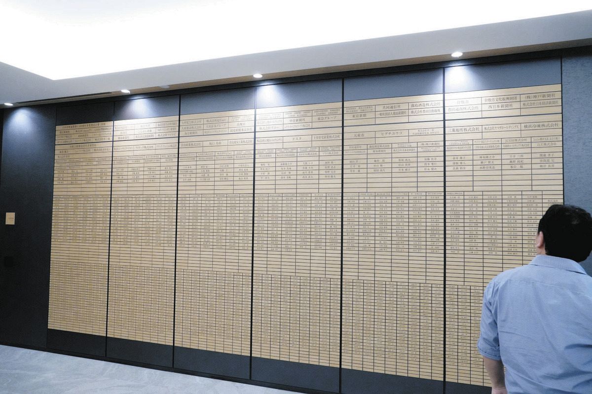 いよいよ館内の視察です。入り口を入ってすぐのロビーで、最初に目に付いたのが建設支援の寄付者の巨大な銘板です。ずらりと並ぶ名前の中から探すこと数分。一番小さいサイズですが、記者の名前も見つけることができました。建物の片隅にひっそり掲示されるものかと思っていたので、うれしい驚きでした。