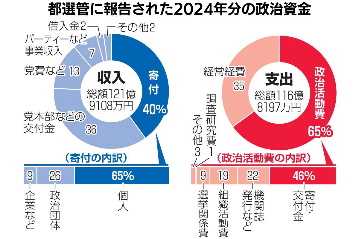 東京都選挙管理委員会は20日、都内で活動する政党支部や政治団体の2024年分政治資金収支報告書を公表した。統一地方選に向けた資金集めが盛んだった前年に比べ、収入、支出ともに減少した。