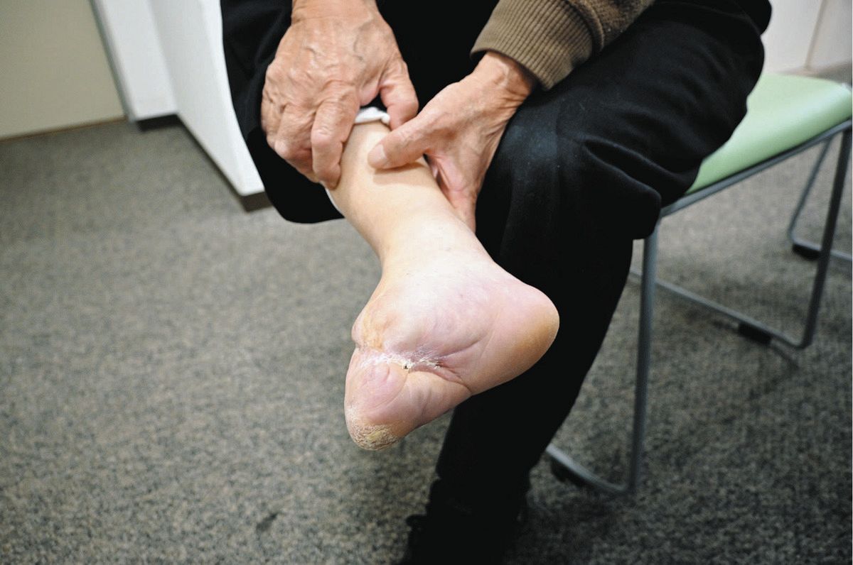 「これが小指やて言われてますわ」と示すが、形は残っていない。感覚はあるが、痛みやかゆみはないという。靴を履けば傷痕は見えないが、歩くときはつま先が折れ曲がり、足を引きずる。
