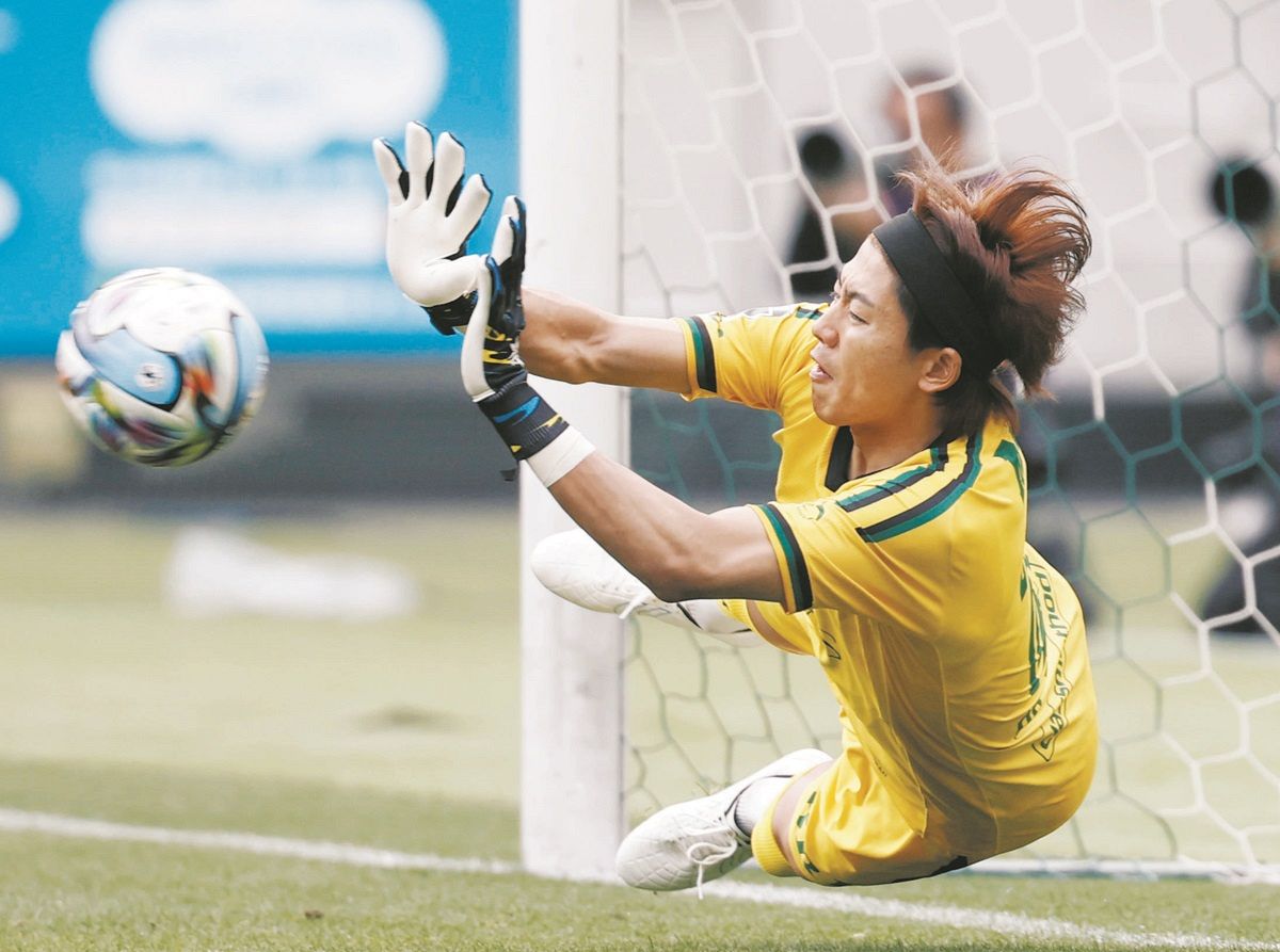 東京VーFC東京PK戦でFC東京3人目のキックを止める東京VのGK長沢=味スタで(共同)