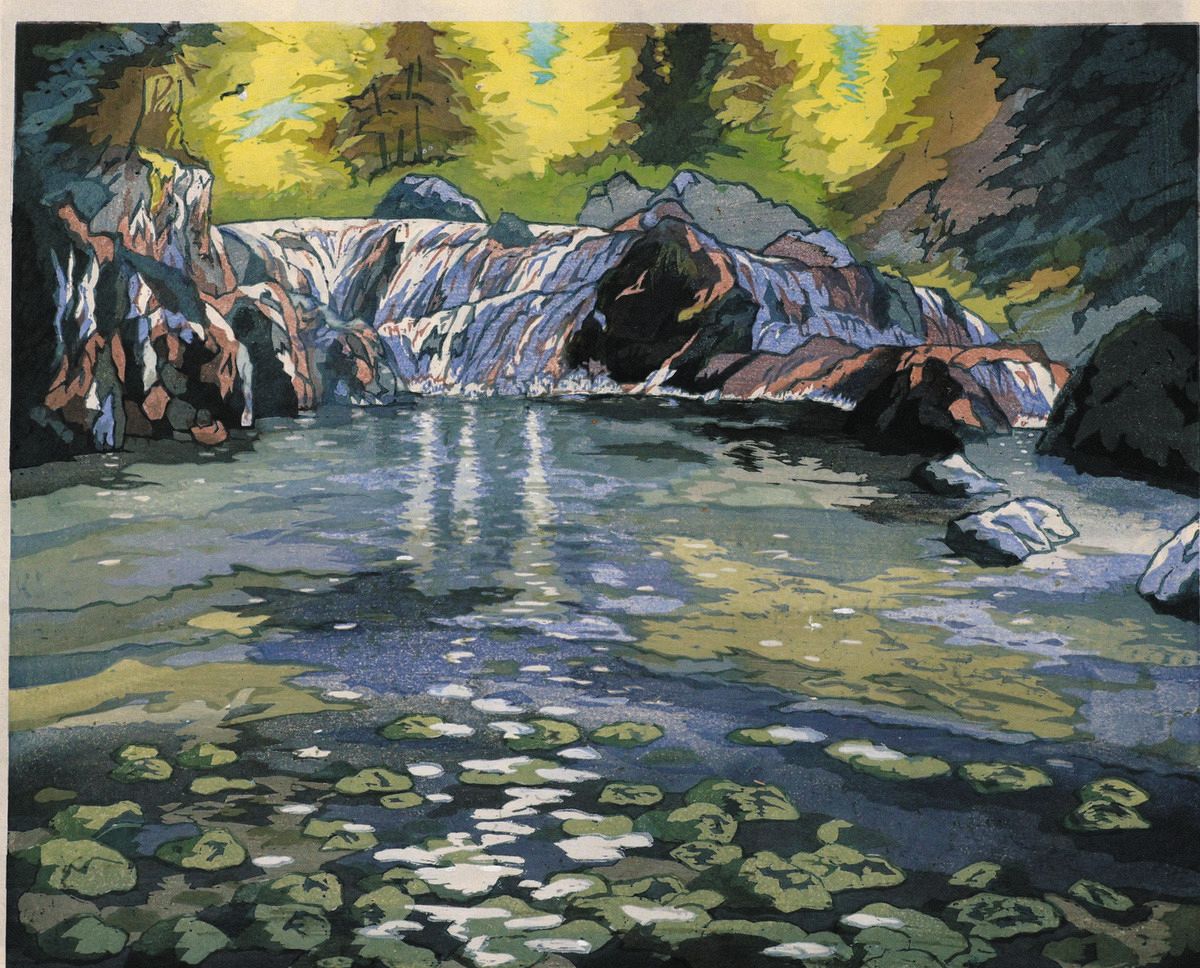 作品「蒼い谷黒部赤木沢」=台東区の木版画工房アルプで