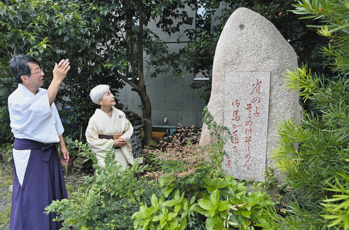 小林一茶の句碑について田中優子さんに説明する大島愛宕神社の浅見昌弘宮司(左)=いずれも江東区で