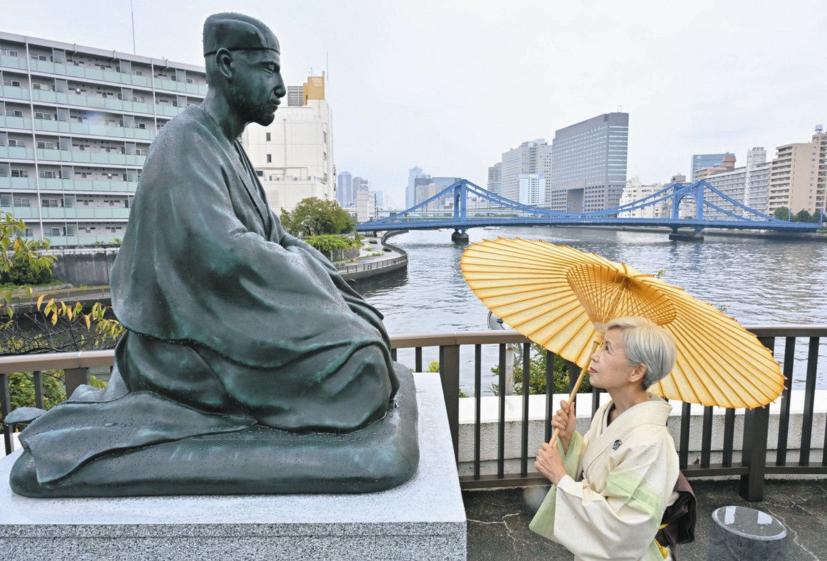 芭蕉庵史跡展望庭園で芭蕉像を見る田中優子さん。後方は隅田川の清洲橋