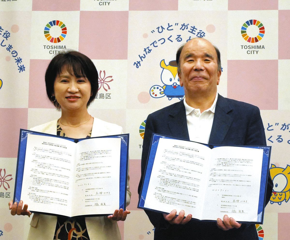 協定を結んだ高際みゆき区長(左)と脇英美社長=豊島区で