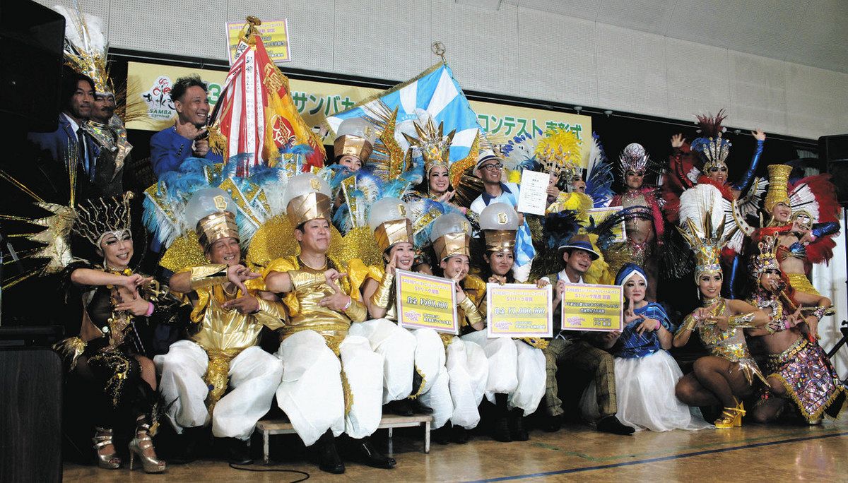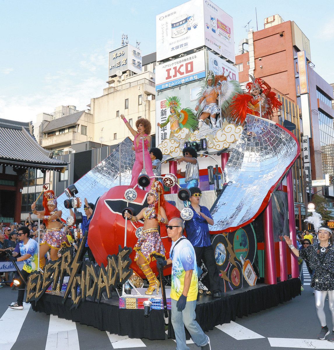 コンテストはテーマの表現や躍動感、衣装、演奏、ダンス、総合評価の6項目で審査し、バルバロスは全項目でトップだった。「電気」がテーマで「ハイーニャ」と呼ばれるトップダンサーは光る羽を背負い、電球の帽子をかぶり、金色に輝く衣装のメンバーも。今年は山車も復活し、チームのロゴがくるくる回り、雷神が集めた電気で雷門の大ちょうちんを割る趣向の豪華な装飾が目を引いた。