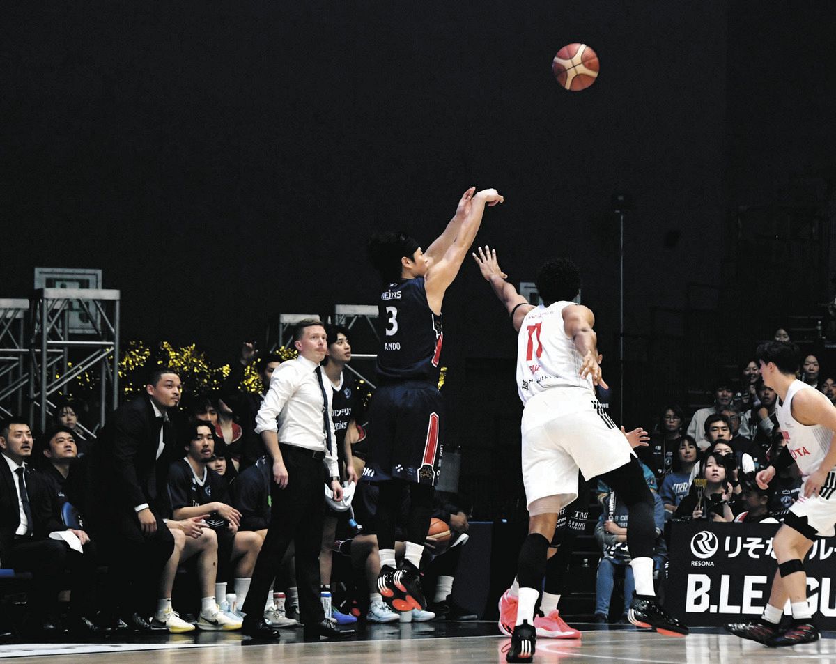 横浜BC-A東京第1クオーター、先制の3点シュートを沈める横浜BCの安藤誓(背番号3)。チームと自身に勢いをもたらし、勝利に貢献した=15日、横浜市の横浜BUNTAIで