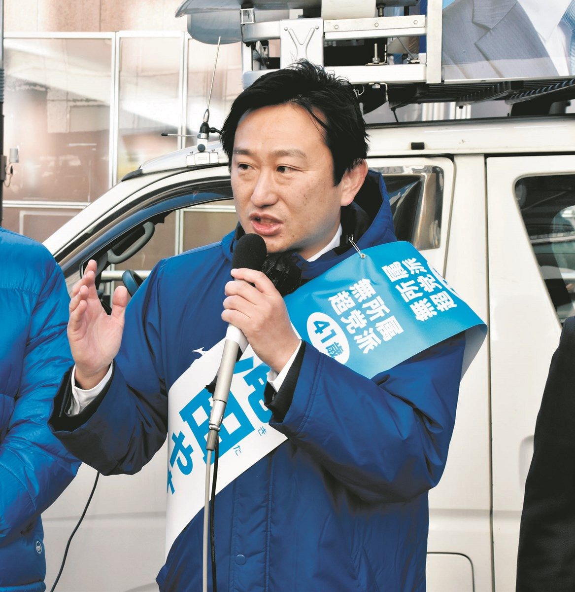 1月の市長選で演説する滝田泰彦氏=1月14日、東京都八王子市で(昆野夏子撮影)