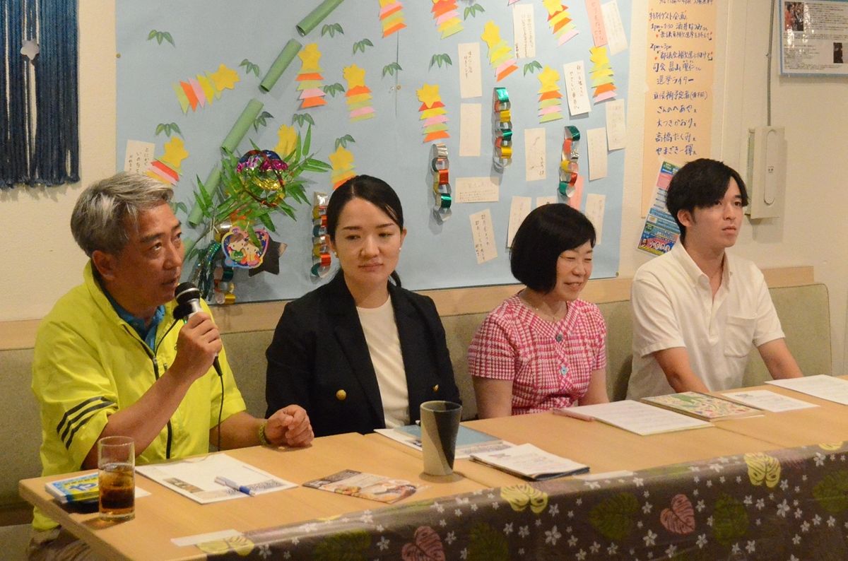 都議選江東区選挙区に出馬を予定している(左から)山崎一輝氏、三戸安弥氏、大嵩崎かおり氏、高橋巧氏=6月16日午後、東京都江東区で