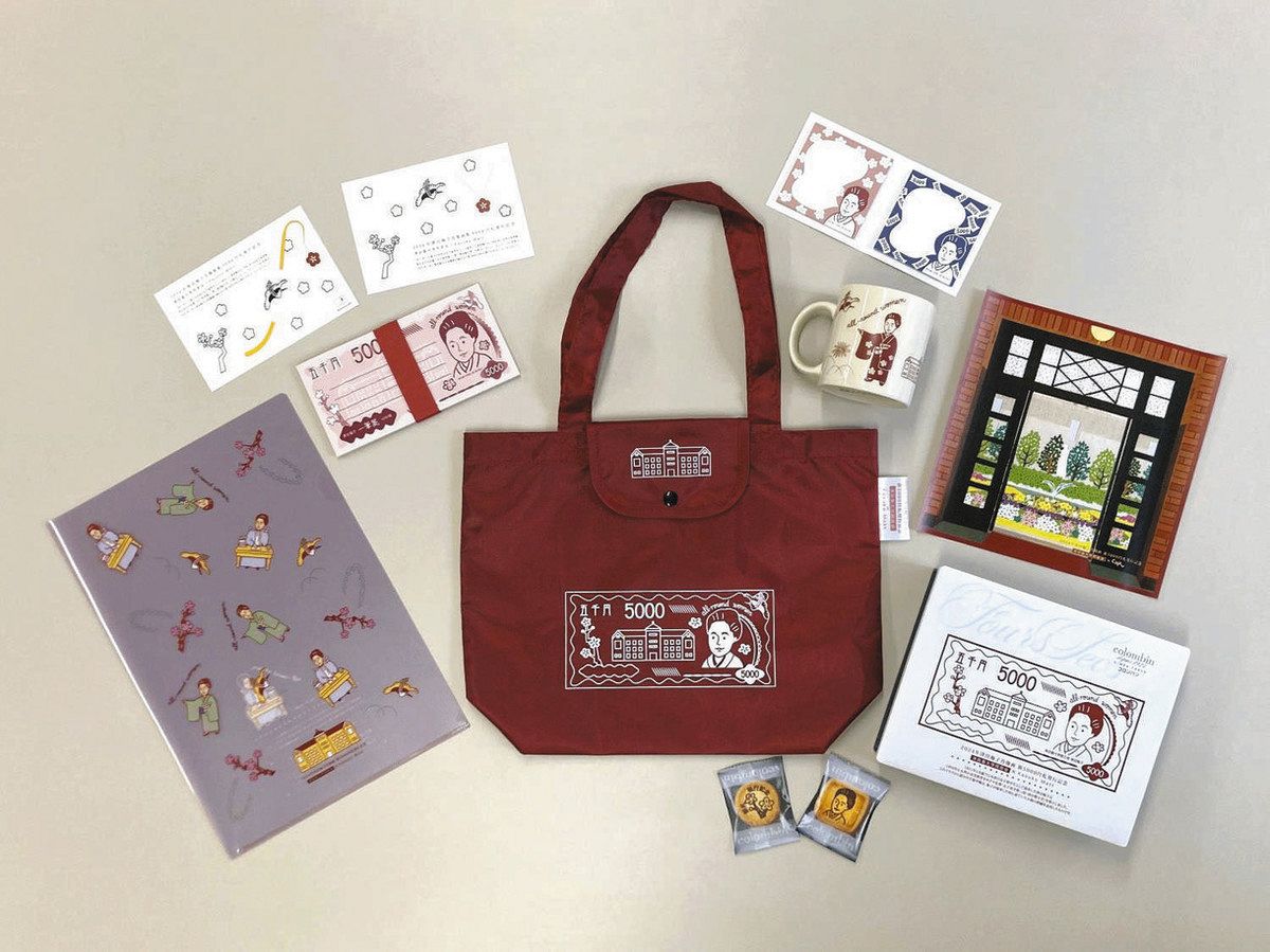 3日に新紙幣が発行されるのに合わせ、新5000円札の肖像となる津田梅子が創設した津田塾大学(東京都小平市)の同窓会は同日、オリジナルグッズの販売を始める。紙幣のイラストを入れたエコバッグや、札束を模した一筆箋など9種類を開発したほか、LINEのスタンプも作った。