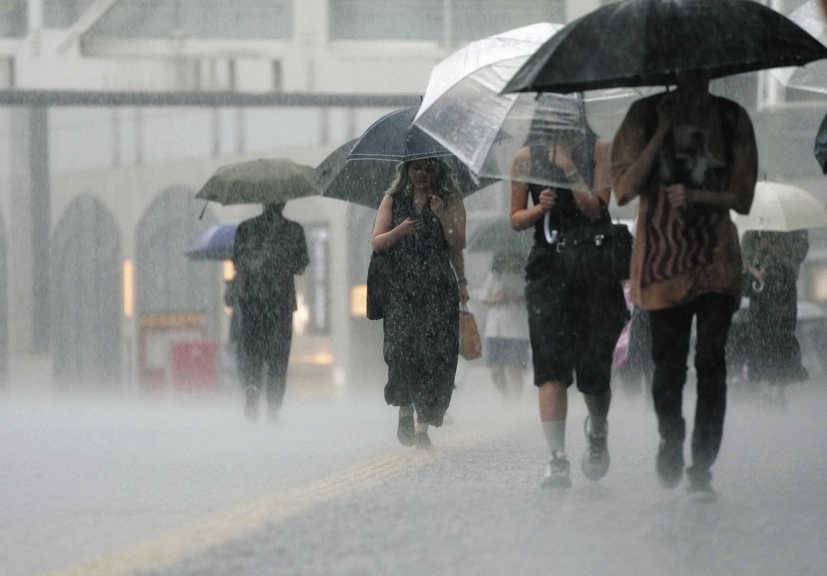 激しい雨が降る中、街を歩く人たち=6日午後5時55分、東京都新宿区で