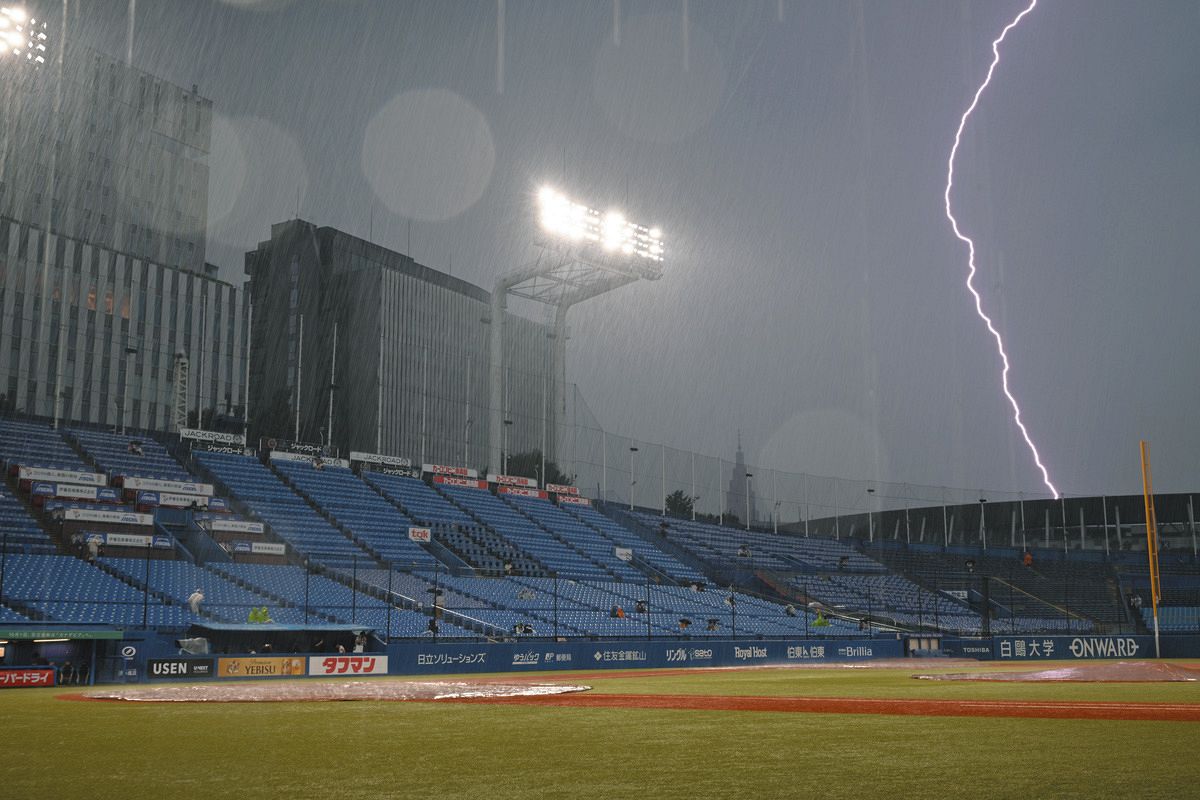 神宮球場周辺に落ちる雷=6日午後4時47分、、東京都新宿区で