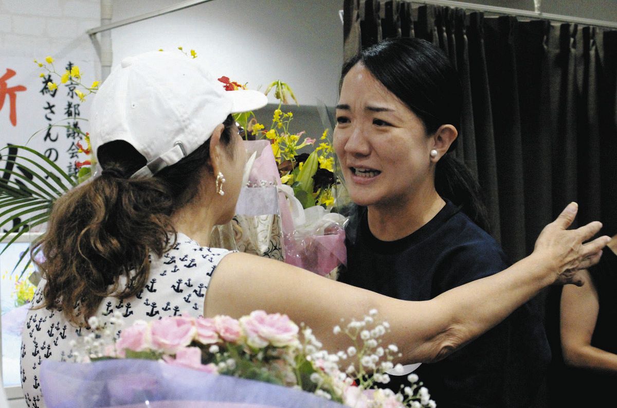 当選を確実にし、喜びをわかちあう三戸安弥氏(右)=7月7日深夜、東京都江東区で(鈴木里奈撮影)