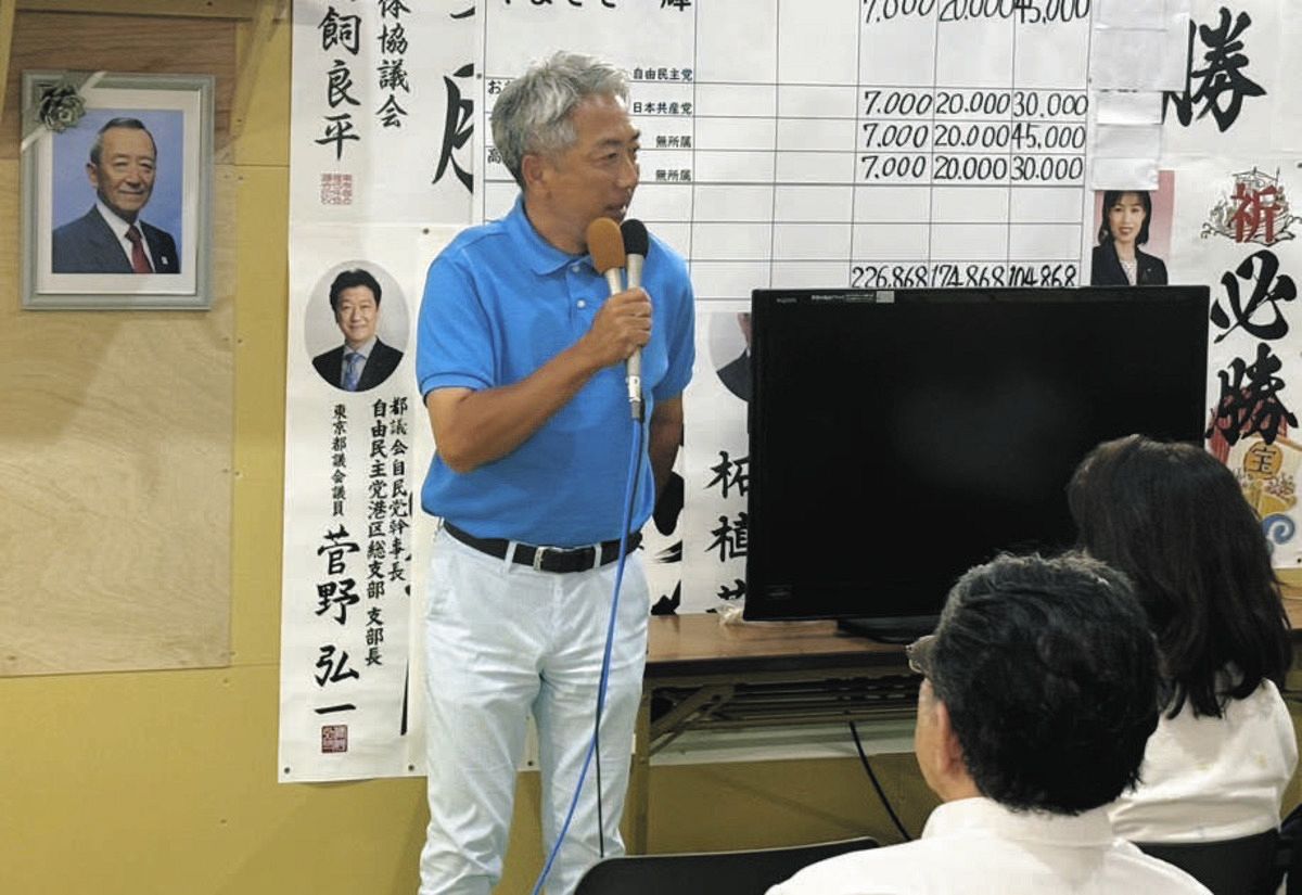 敗戦の弁を語る山崎一輝氏=7月7日深夜、東京都江東区で(井上真典撮影)