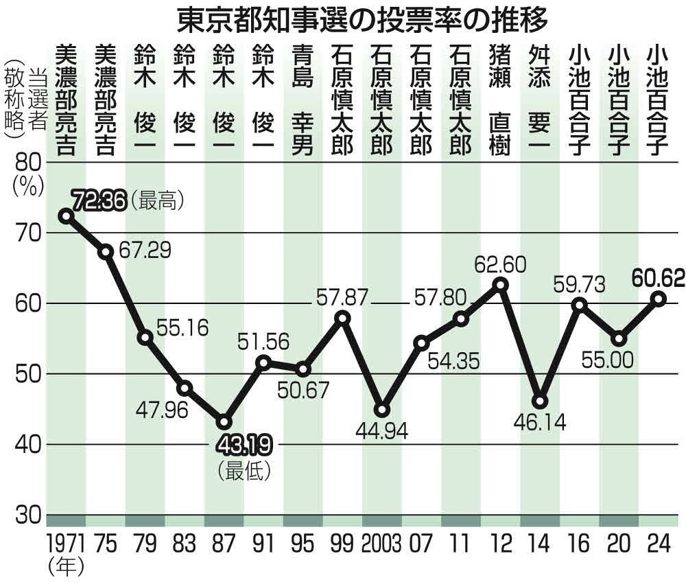 都知事選は今回を含め22回あり、投票率が最も高かったのが1971年の72.36%で、革新系の美濃部亮吉氏が保守系を破って再選した。最低は87年の43.19%で、鈴木俊一氏が次点に137万票差をつけて3選した。(荒井六貴)