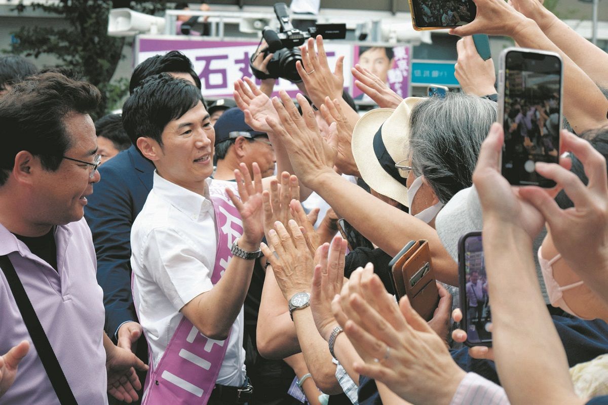 聴衆とタッチを交わす石丸伸二氏=6月26日
