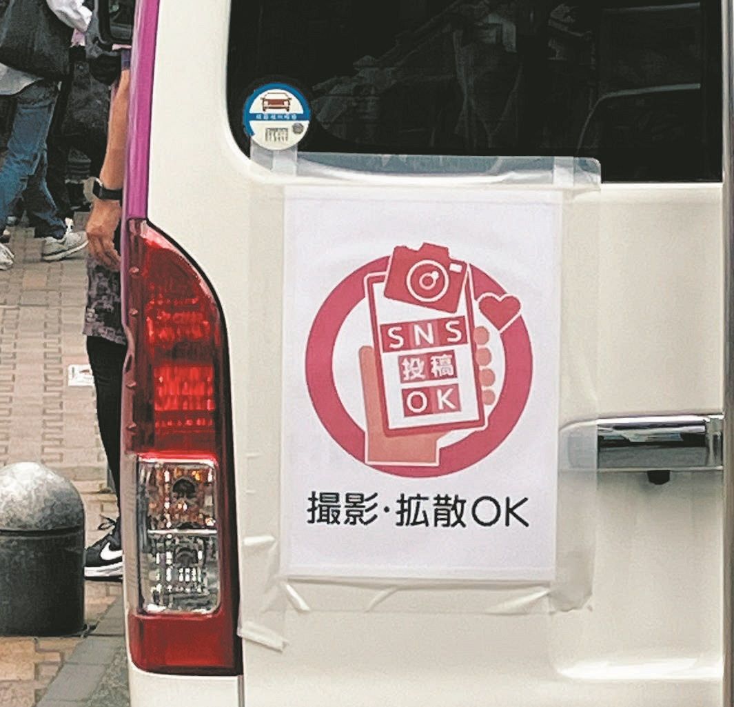 石丸氏の選挙カーに貼られた「撮影・拡散OK」のチラシ