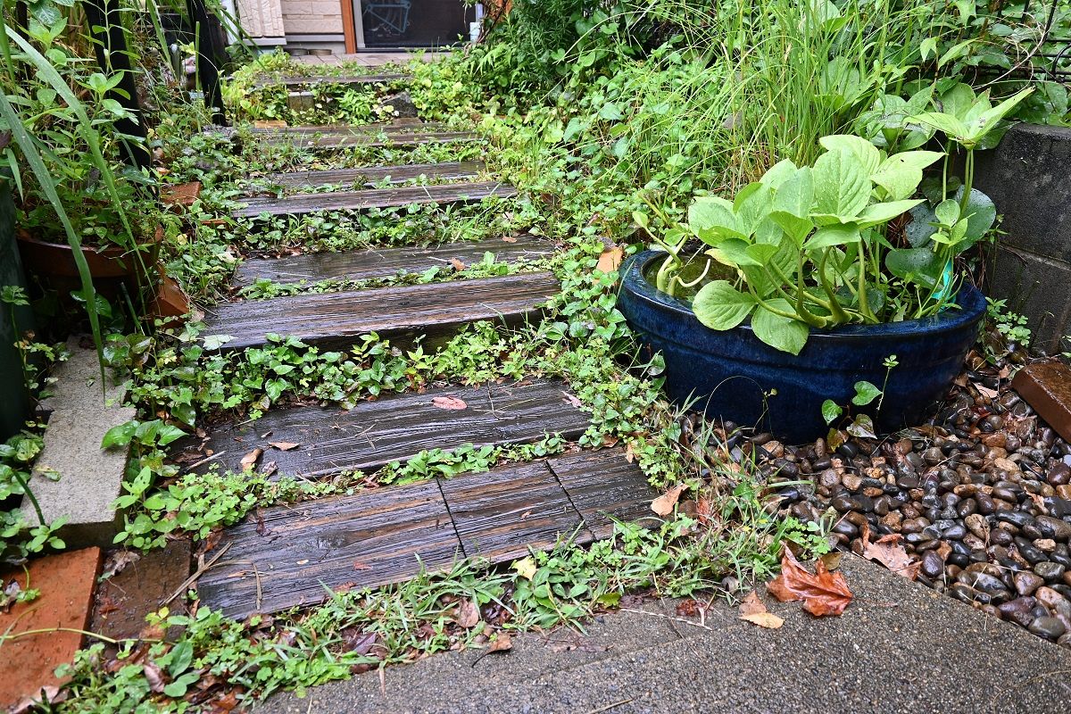 玄関から駐車場までの道にセリやユキノシタが生える。水をためたつぼにはタヌキモも。ダンゴムシが歩き、トンボが飛んでくる。