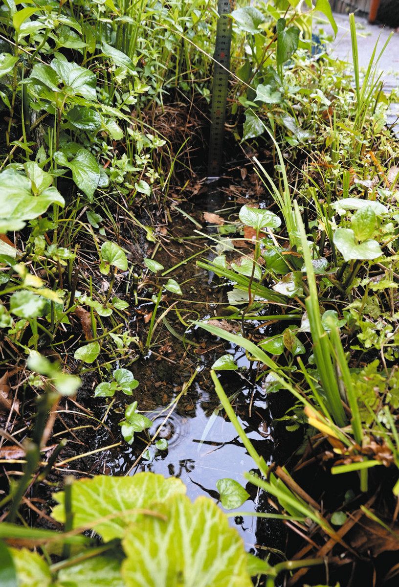 試行錯誤の末、家族やカエル会のメンバーら10人ほどの手作業で、「できるだけ在来種」の植物をそろえた緑の庭に雨が流れ込む仕組みを整えた。雨水タンクや取水器の購入などに数十万円ほど使った。
