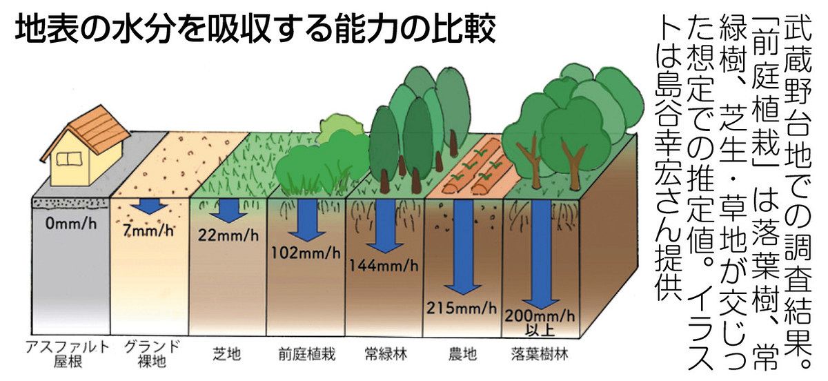 草むしりの手間を嫌がりコンクリートで固めた庭は、洪水を増やす要因になっている。土の庭なら地下にしみ込んだはずの水が全て、川に流れ込むからだ。